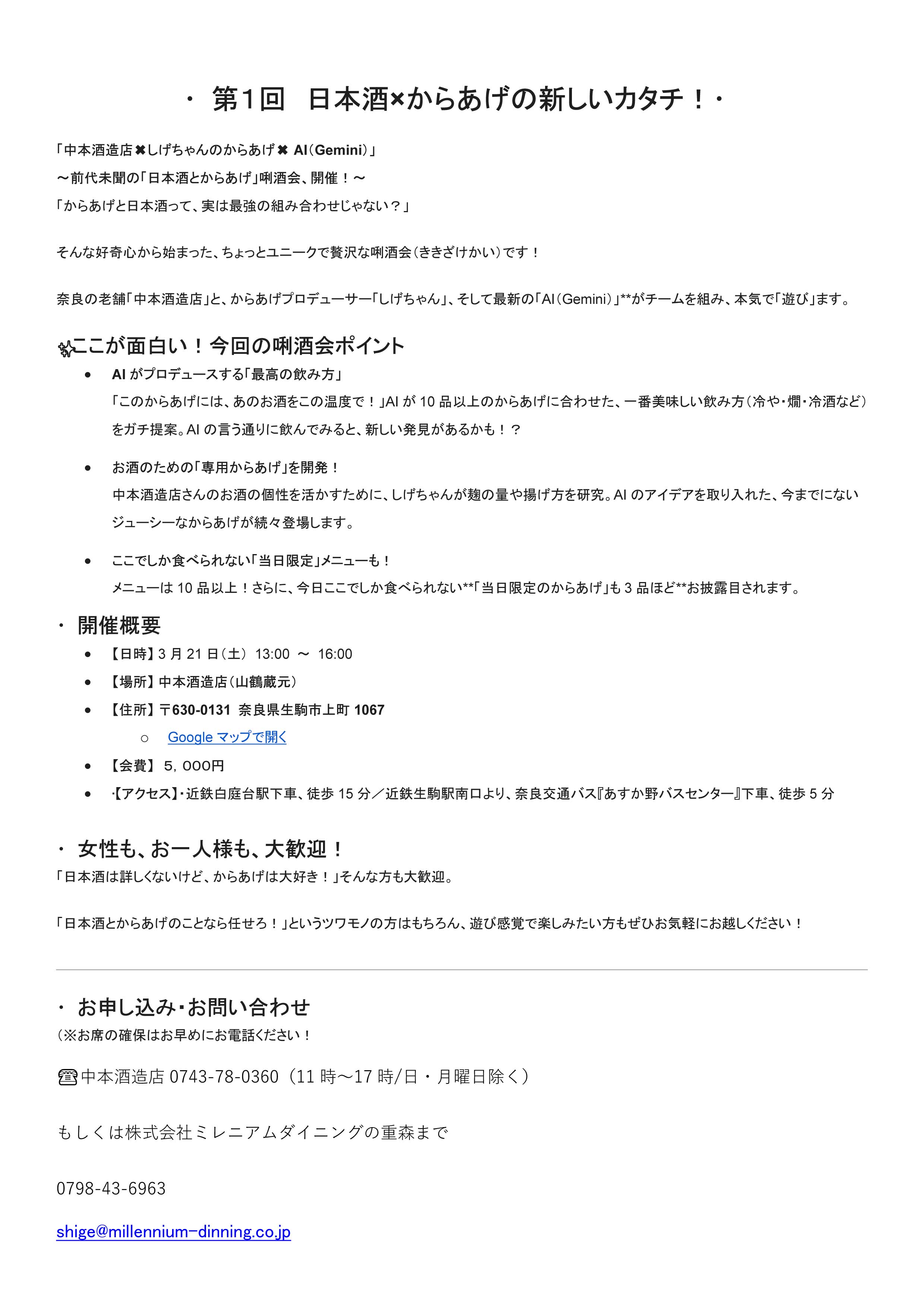 3月に奈良県の酒蔵さんとコラボして、からあげと日本酒の唎酒会を開催します。